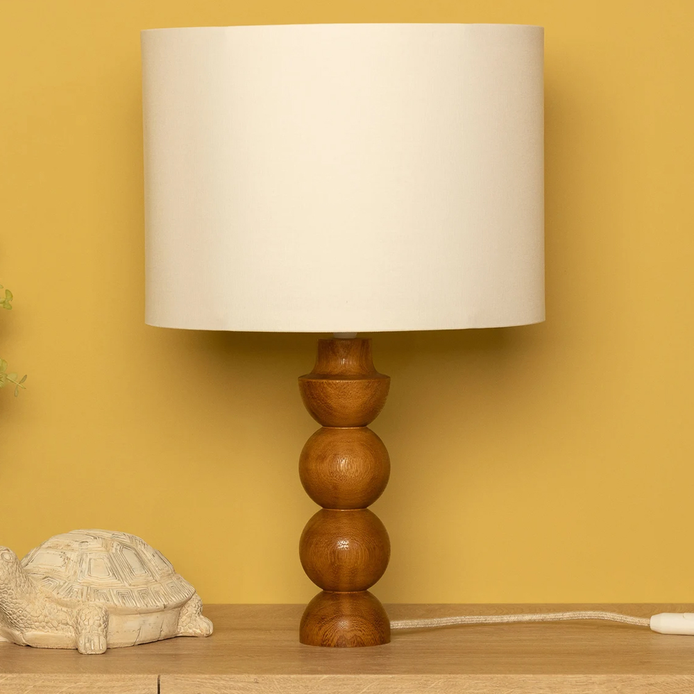 Add a touch of retro elegance and warm charm to your home with this mid-century modern spindle wood table lamp. The lamp features a beautifully turned wooden base, showcasing a classic spindle design with rounded, stacked elements that evoke timeless craftsmanship. Topped with a complementary neutral fabric drum shade, it casts a soft, inviting glow, perfect for creating a cozy and stylish atmosphere.