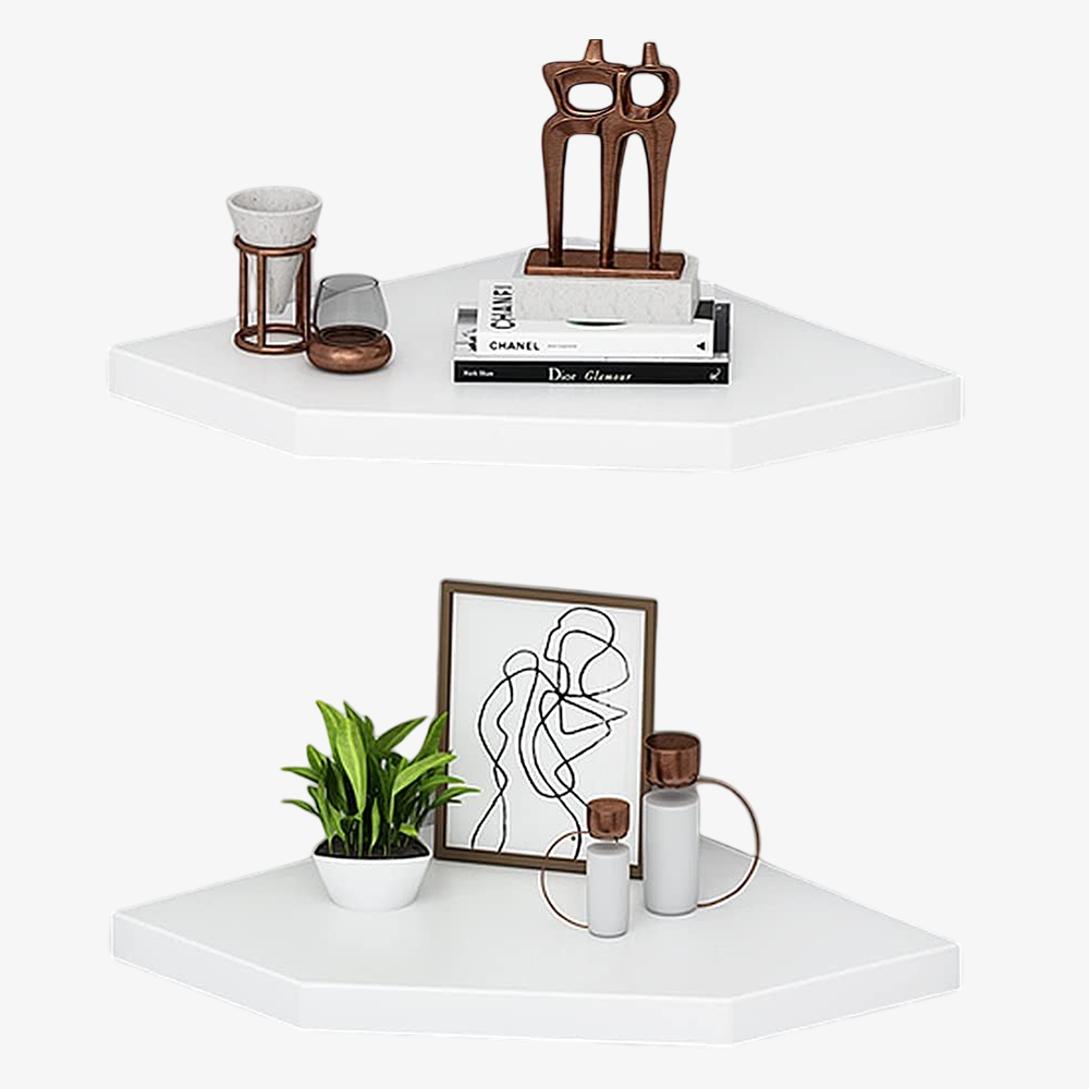 Transform unused corner space with this Set of 2 Minimalist Floating Shelves. Designed to fit snugly into any 90-degree corner, the unique five-sided (pentagon) shape provides ample space for plants, books, and decor. The concealed mounting hardware creates a seamless, clutter-free look.